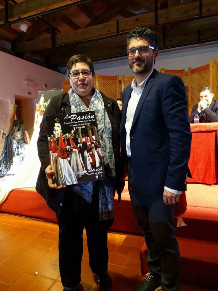 Los encargados de presentar y destapar el cartel de la Semana Santa 2018 fueron la pregonera de este año, Isabel Madrigal, y el autor de la fotografía del cartel, Esteban Sánchez, quien recibió un obsequio.