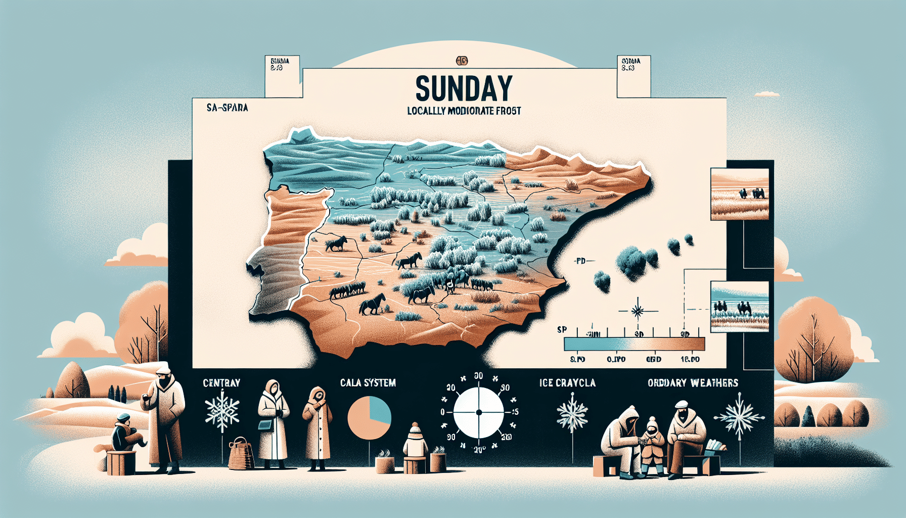 Las temperaturas experimentarán ligeros cambios, con un predominio de descensos en las máximas, especialmente en las zonas bajas de las sierras de los sistemas Central e Ibérico. Se esperan heladas débiles generalizadas, aunque con menor probabilidad en el extremo occidental de la comunidad y en el campo de Hellín. No obstante, se prevén heladas localmente moderadas en los sistemas Central e Ibérico y en la Mancha. Además, los vientos serán flojos y variables durante el día.