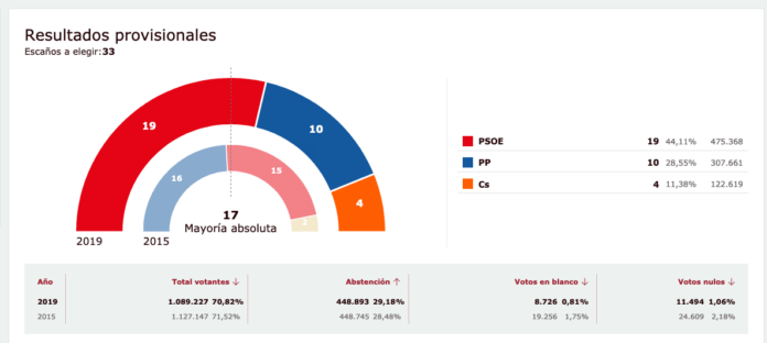 La participación en las Elecciones Municipales y Autonómicas en Castilla-La Mancha paso del 71,52% de participación en 2015 al 70,82%, más de 1.089.000 castellano-manchegos votaron en estos comicios. El PSOE obtuvo 19 escaños a lar cortes regionales consiguiendo así la mayoría absoluta, 10 para el Partido Popular y 4 para Ciudadanos.