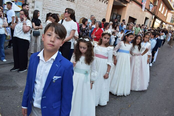 Un cortejo en el que han participado los niños que este año han hecho su primera comunión en la parroquia, Centro Juvenil Puerto Bosco, Scouts, los azulados Seises, cooperadores Salesianos, Asociación de Antiguos Alumnos, Archicofradía y Asociación de María Auxiliadora, cofradías y hermandades de la ciudad, así como el alcalde, Miguel Ángel Ruiz, y diversos ediles de la Corporación Municipal.