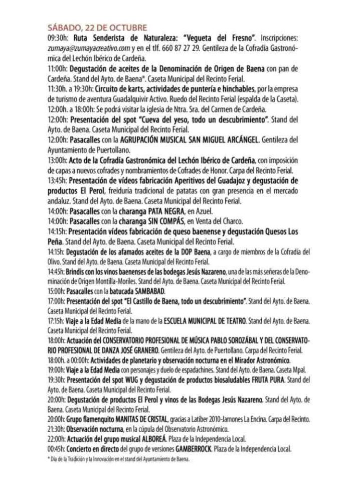 El sábado, día 22 de octubre, a las 12 horas, realizará un pasacalles de la Agrupación Musical San Miguel Arcángel, mientras que a las 18 horas, está programada una actuación en la carpa del Recinto Ferial de alumnos y alumnas del Conservatorio Profesional de Música “Pablo Sorozábal” y del Conservatorio de Danza «José Granero».