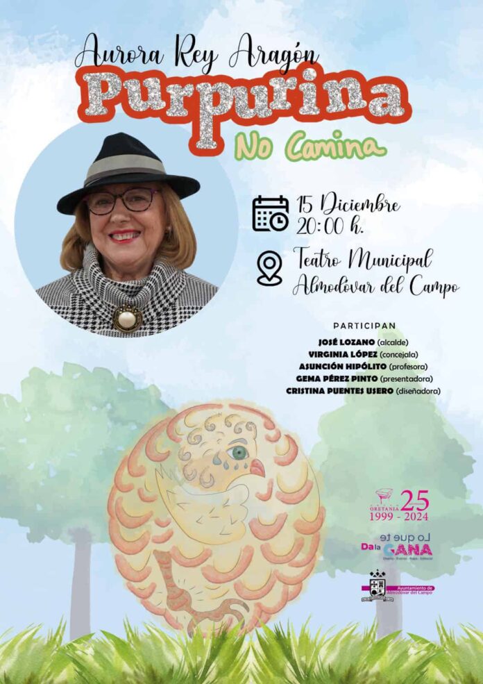 El libro infantil “Purpurina no camina” se pondrá a la venta en estas Navidades, a partir del día 20 de diciembre. Previamente el 15 de diciembre, a las 20:00 horas, en un acto infantil con niñas y niños de Almodóvar del Campo, se dará a conocer la última obra de la escritora y poeta Aurora Rey Aragón, en esta ocasión el cuento infantil “Purpurina no camina”. El acto será presentado por la comunicadora Gema Pérez Pinto, quien estará acompañada, además de por la autora, por la profesora Asunción Hipólito, la diseñadora Cristina Puentes Usero, la concejala de Educación, Virginia López y el alcalde de la localidad, José Lozano.
