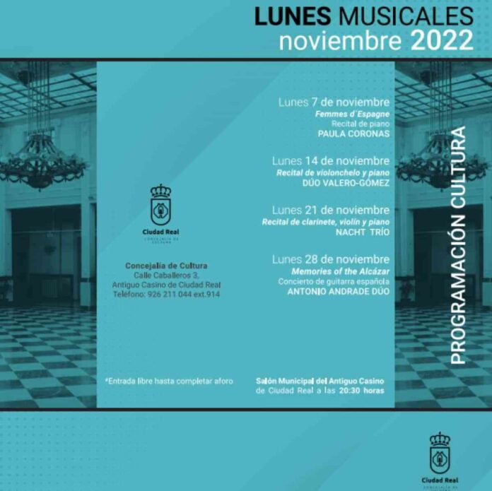 Mientras que el 28 de noviembre se podrá disfrutar de “Memories of the Alcázar” un concierto de guitarra española con Antonio Andrade Dúo. Eventos organizados por la concejalía de Cultura del ayuntamiento de Ciudad Real.