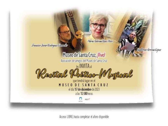 Museo de Santa Cruz, ¡Vivo!, tras dos años en los que ha resultado imposible realizar este tradicional acto de cierre de actividades del año en curso, ha preparado un Recital Poético.Musical que tendrá lugar el próximo sábado, día 17 de diciembre, a partir de las 12:00 horas, en la Sala del Toisón, en el Museo de Santa Cruz.