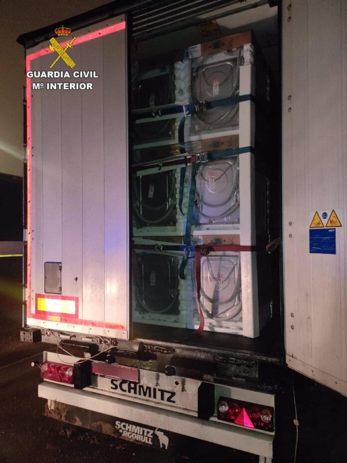 Durante la continuación de las indagaciones, los agentes localizaron otra cabeza tractora y otro semirremolque, ambos con placas de matrícula falsificadas, que también habían sido sustraídos en el mismo polígono. Según el representante de la empresa afectada, se informó que los dos semirremolques recuperados transportaban una carga considerable de electrodomésticos, que incluía 268 lavadoras, 10 lavavajillas y 6 frigoríficos.
