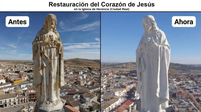 La Parroquia Inmaculada Concepción de Herencia, en la provincia de Ciudad Real, ha compartido en sus redes sociales el sorprendente proceso de limpieza y restauración de la emblemática figura del Sagrado Corazón de Jesús, conocido popularmente como «Calalo». Esta escultura, que se posiciona en lo alto de la iglesia, es unicono del paisaje urbano y un pilar en la memoria colectiva de los herencianos. Mediante imágenes del antes y el después, la comunidad parroquial ha evidenciado la intensa labor realizada, la cual ha permitido recuperar la visibilidad y belleza de la escultura después de años de exposición a condiciones climáticas adversas.