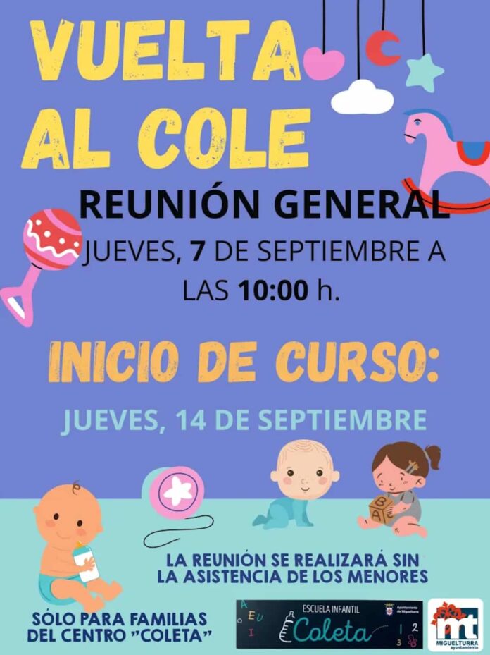 Una reunión general tendrá lugar el jueves 7 de septiembre de 2023 a las 10 de la mañana previa al inicio del curso que será el 14 de septiembre, en la escuela infantil “Coleta” dependiente del área de Educación del Ayuntamiento de Miguelturra (Ciudad Real) ha informado la dirección de este centro educativo.