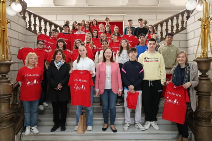 Como parte del recuerdo del encuentro en el Ayuntamiento, la alcaldesa obsequió a cada estudiante con una camiseta con la imagen de #EsAlcázar, explicándoles los elementos del logotipo, como el molino, el tren, el torreón o el flamenco, símbolos representativos de la identidad de la ciudad.