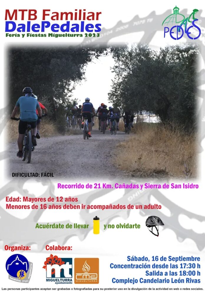Una Ruta especial MTB (bicicleta de montaña) familiar DalePedales se ha organizado con motivo de la Feria y Fiestas de Miguelturra (Ciudad Real) en honor a la Virgen de la Estrella (Ciudad Real) para el 16 de septiembre. Y forma parte de la programación deportiva de las Ferias y Fiestas de Miguelturra 2023, evento que es organizado por Fondistas Miguelturra en colaboración con el área de Deportes del consistorio.