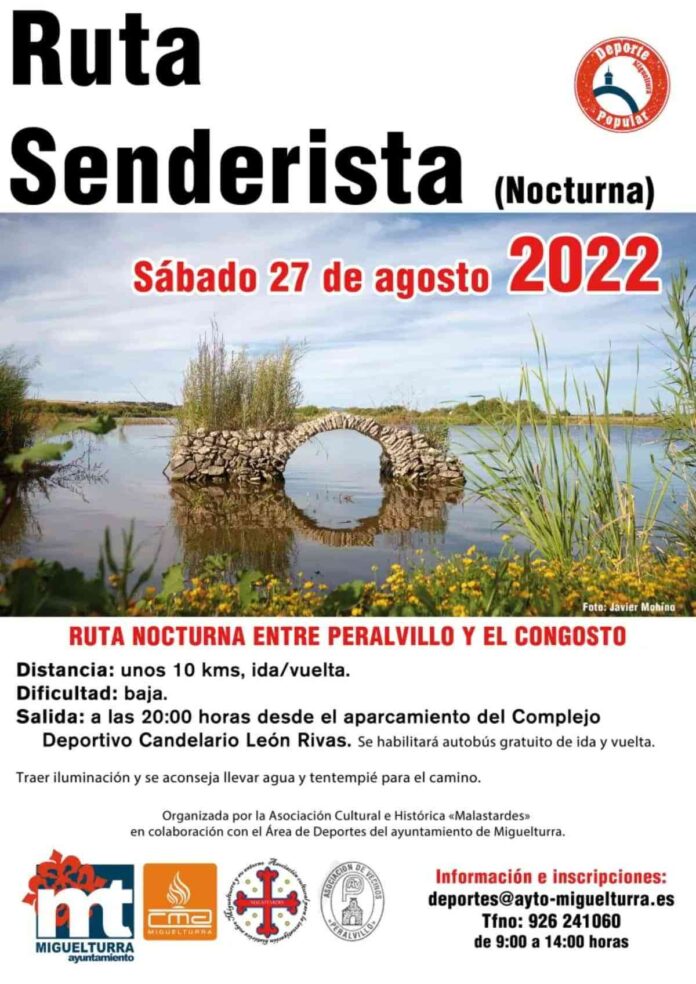Una Ruta Senderista Nocturna entre Peralvillo y el Congosto tendrá lugar el sábado 27 de agosto. Así lo informa el área de Deportes del ayuntamiento de Miguelturra (Ciudad Real). La actividad tendrá salida desde el aparcamiento del complejo deportivo Candelario León Rivas. Habilitándose un autobús de ida y vuela para el transporte.