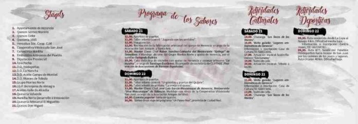 En esta ocasión, un producto tan herenciano como el queso, marcará el desarrollo de esta atractiva feria, en la que siete restaurantes del municipio ofertarán tapas relacionadas con el queso para que vecinos y visitantes puedan degustarlo y disfrutar de este manjar manchego. Un total de 21 stand ocuparán el Pabellón Municipal para dar a conocer las variedades de queso y de productos relacionados con la gastronomía y el patrimonio de Herencia. Además, durante los dos días habrá talleres infantiles, visitas guiadas a lugares emblemáticos y conciertos musicales.