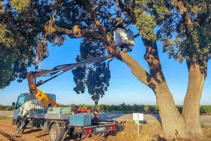 La encina conocida popularmente como la “Carrasca de la Sandalia” que se encuentra junto a la carretera de Pedro Muñoz, ha sido saneada esta mañana por el área de Parques y Jardines del ayuntamiento de Tomelloso (Ciudad Real) por daños que había sufrido el pasado 24 de agosto por fuertes vientos que dañaron las ramas.