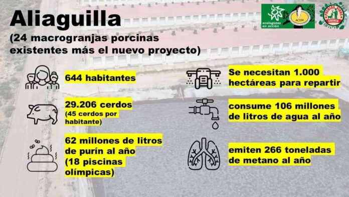 Esta macrogranja viene a sumarse a las 24 ya existentes en la localidad, lo que arrojaría un total de 29.206 cerdos para una población de 644 habitantes. Ello supone una ratio de 45 cerdos por habitante. Incluyendo este proyecto, la cabaña porcina total de Aliaguilla generará anualmente 62,7 millones de litros de purín, suponiendo 212 toneladas de nitrógeno al año que necesitarán un mínimo de mil hectáreas para su dispersión (el 44% de la tierra de labor de Aliaguilla) y que consumirán 106 millones de litros de agua, el triple que toda su población.