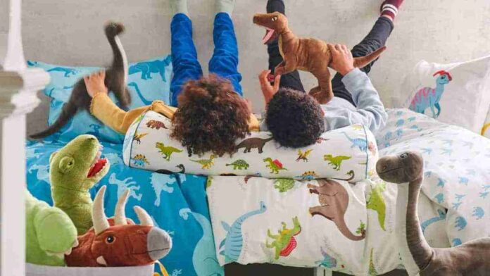 Esta serie textil de Ikea te permite renovar el dormitorio de los pequeños de la casa. Podrás crear una maravillosa atmósfera prehistórica. Recurriendo a los diseños de brontosaurios y tiranosaurios Rex. Que viene en magníficas fundas nórdicas estampadas, alfombras, cortinas, un cojín y mucho más. Los consentidos del hogar estarán realmente felices con estos nuevos detalles del dormitorio. Volar la imaginación será tan fácil a la vista de esta bonita propuesta. Con fundas nórdicas y fundas de almohada con estampados de dinosaurios.
