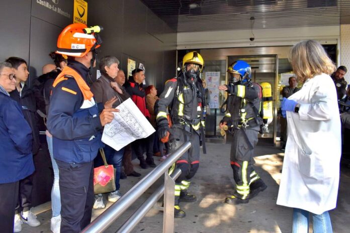 A los diez minutos de la activación de la alarma, llegaron efectivos de Protección Civil, un camión y la grúa de bomberos de Emergencia, así como agentes de la Policía Nacional y Local, quienes coordinaron las labores de seguridad en la zona. En el transcurso del ejercicio, los bomberos rescataron a una enfermera que se había quedado atrapada en la parte superior del edificio; afortunadamente, logró salir por su propio pie, y no fue necesaria la intervención del camión grúa. Posteriormente, se llevó a cabo la extracción de humo del interior del centro.
