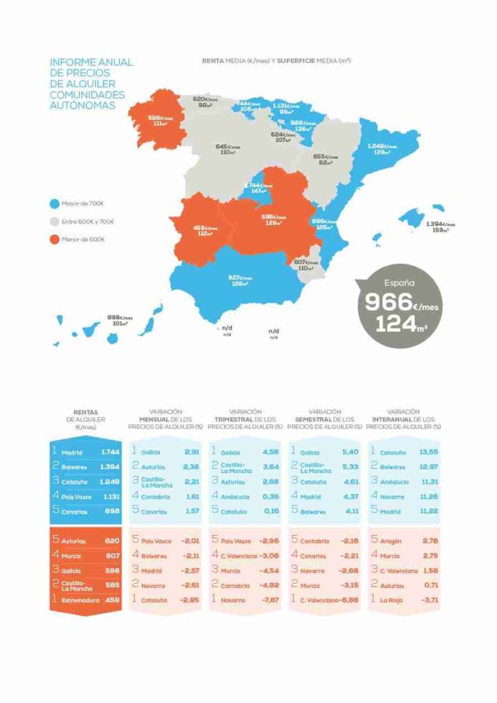 Castilla-La Mancha fue la segunda autonomía con la mensualidad más barata para los inquilinos, solo por detrás de Extremadura (459 €/mes). Por su parte, el piso tipo de alquiler en España tuvo en diciembre una superficie media de 124 metros cuadrados y una mensualidad media de 966 euros. Esta cifra marcó una caída mensual del -2,03% y una trimestral del -1,63%. En el último semestre, creció un 2,44%; e interanualmente, se incrementó un 8,54%.