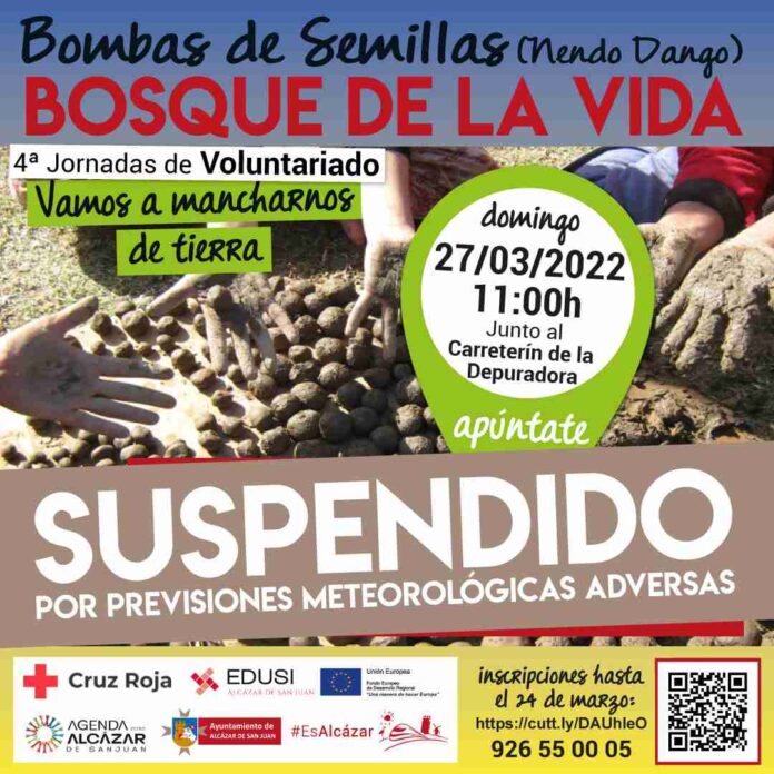 La concejalía de Medio Ambiente del Ayuntamiento de Alcázar de San Juan, informa de la suspensión de la cuarta Jornada de Voluntariado “Restauración de praderas mediterráneas con plantas autóctonas” prevista para el próximo domingo 27 de marzo, ante las previsiones meteorológicas adversas.