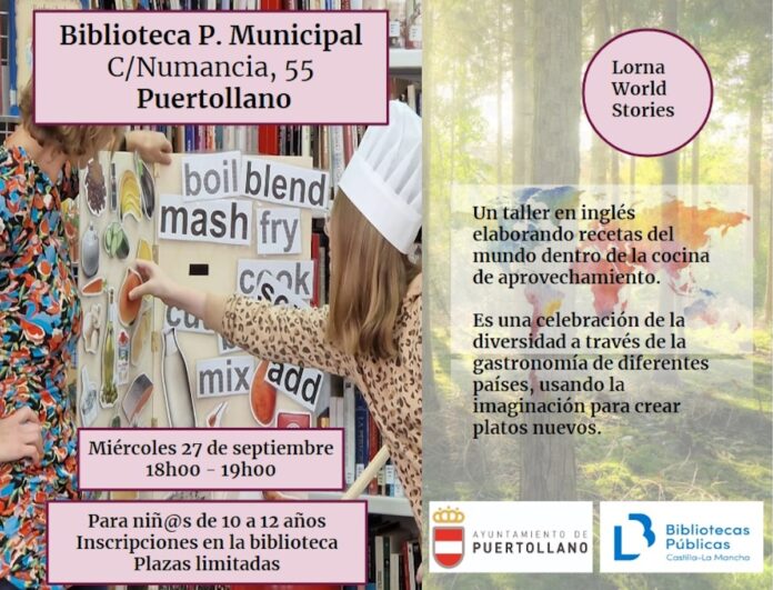 Un taller en inglés de elaboración de recetas del mundo se llevará a cabo el próximo miércoles 27 de septiembre en la biblioteca pública de Puertollano (Ciudad Real) para niños de 10 a 12 años, en horario de 18 a 19 horas.