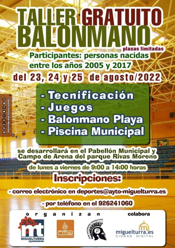 Un Taller gratuito organizado por el Área de Deportes y el Club de Balonmano de Pozuelo de Calatrava en colaboración con el portal web www.miguelturra.es tendrá lugar los días 23, 24 y 25 de agosto. Esta nueva edición de este taller forma parte de la programación del área de Deportes del ayuntamiento de Miguelturra (Ciudad Real) para el verano de 2022.