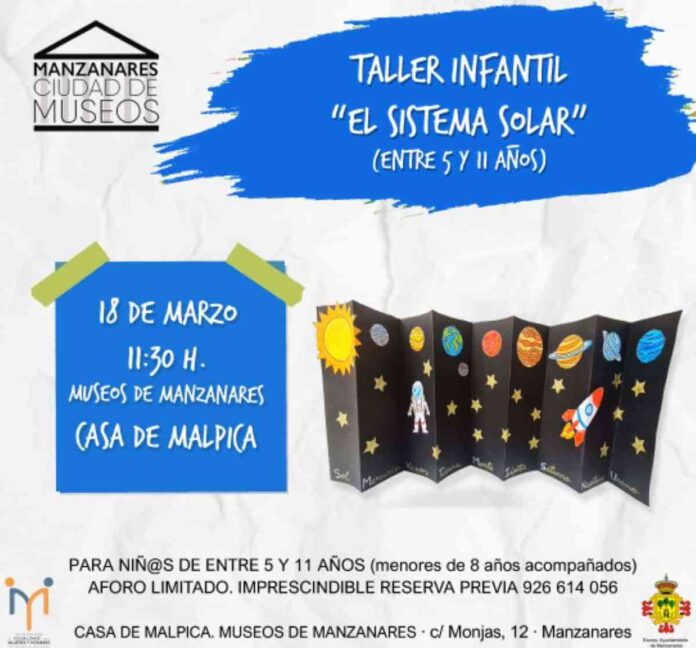 El taller infantil “El Sistema Solar” tendrá lugar el 18 de marzo a las 11:30 horas en el Museo del Queso Manchego, Archivo-Museo Ignacio Sánchez Mejías y Colección de Arte en Manzanares (Ciudad Real) tal como informa el ayuntamiento de la localidad.