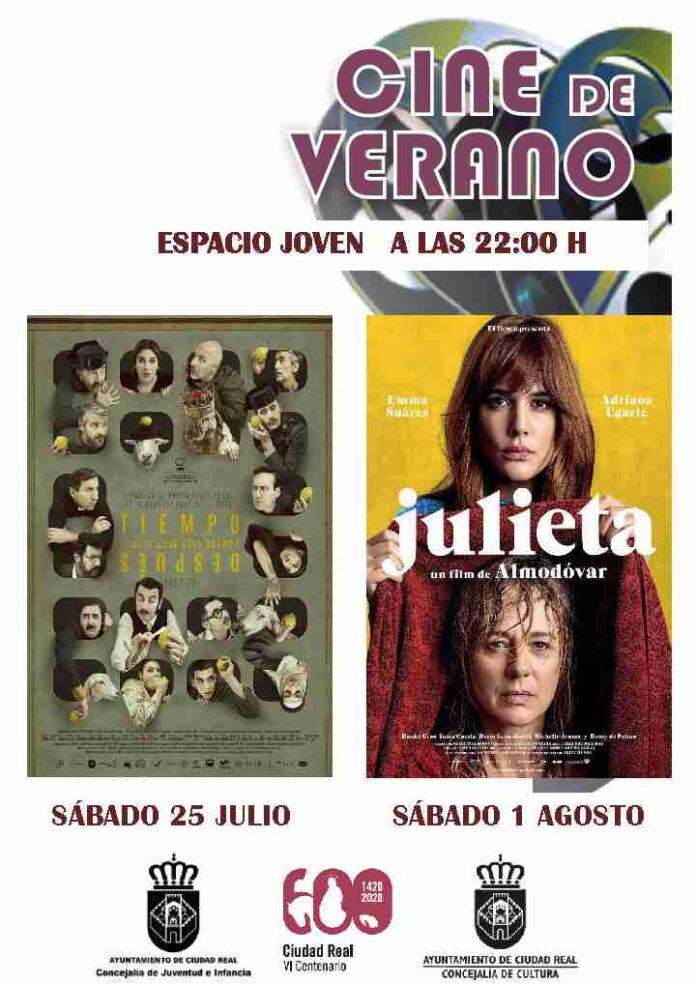 Las próximas proyecciones previstas dentro de la programación del Cine de Verano, “Tiempo Después” este sábado 25 de julio y “Julieta” el próximo sábado 1 de agosto se trasladan al Espacio Joven Ciudad Real de la calle Barcelona. Las dos sesiones comenzarán a las 22 horas.