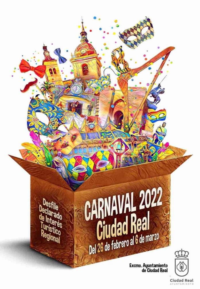 Todo está preparado en Ciudad Real para abordar el Carnaval 2022, que recuperará espacios abiertos, como la Plaza Mayor, para algunos eventos como el pregón del día 26 de febrero a cargo de los monologuistas “Fontecha y Suko”; la tradicional “sardinada” del miércoles de ceniza en la Puerta de Toledo o el espectáculo “Musical pintura y la Pandilla Vainilla” en el Teatro Quijano para los más pequeños. El “Domingo de Piñata”, fiesta que está declarada de Interés Turístico Regional. El Ayuntamiento de Ciudad Real repartirá 25.500 euros en premios para los participantes del gran desfile del Concurso Nacional de Carrozas y Comparsas, cuya afluencia se prevé ligeramente inferior a los años prepandémicos. El cartel ganador que anuncia el Carnaval de Ciudad Real ha sido realizado por Rubén Lucas García bajo el lema “Por fin” y representa una caja de la que salen los principales emblemas y estandartes de la ciudad con una explosión de color en alegoría a la recuperación de esta fiesta, que el año pasado no se pudo celebrar por culpa de la pandemia.