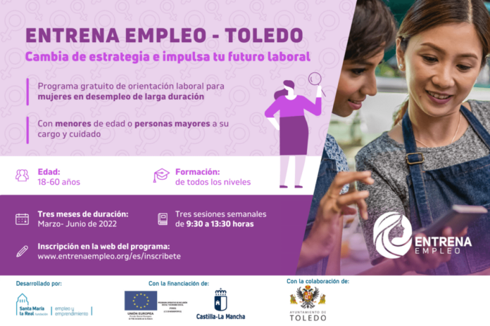 Se encuentra abierto el plazo de inscripción para participar del programa “Entrena Empleo”, que tiene como objetivo mejorar la empleabilidad y la inserción laboral de mujeres en desempleo de larga duración (más de un año continuado de paro) y desconectadas del mercado de trabajo después de haberse dedicado a la maternidad o al cuidado de personas familiares. El proyecto lo impulsa la Fundación Santa María la Real; cuenta con cofinanciación del Fondo Social Europeo y del Gobierno de Castilla-La Mancha; y la colaboración del Ayuntamiento de Toledo.