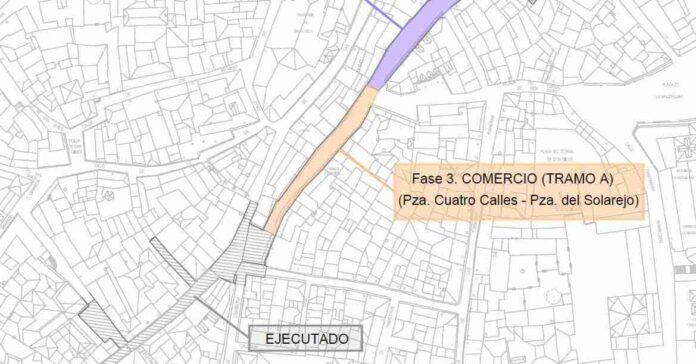 El Ayuntamiento de Toledo continúa este martes las obras de mejora de los servicios y renovación del pavimento de la calle Comercio y aledañas tras la Semana Santa, tal y como se acordó con los comerciantes y empresarios de la zona. El siguiente tramo de actuación va desde la plaza de las Cuatro Calles hasta la plaza del Solarejo.