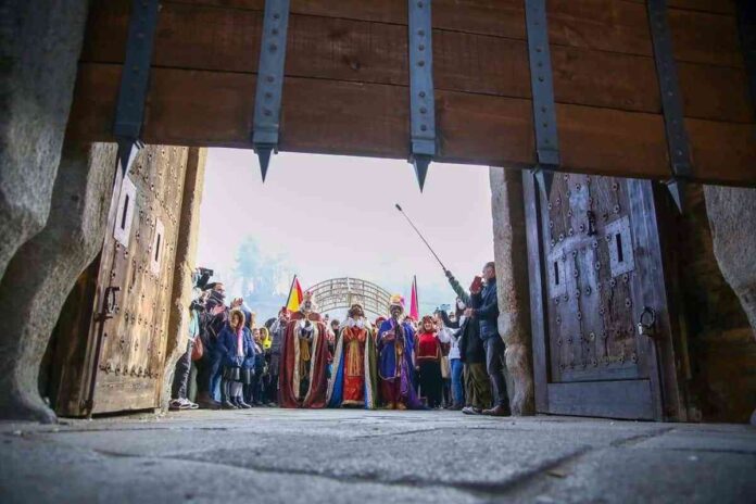 Las trompetas han dado paso al izado del rastrillo del torreón recuperado por el Ayuntamiento de Toledo a través de la Escuela Municipal de Empleo y así, Melchor, Gaspar y Baltasar han hecho su entrada triunfal en la ciudad a la que llegan, según ha indicado Melchor, llenos de ilusión y cargados de regalos y de sorpresas para los más pequeños de Toledo.
