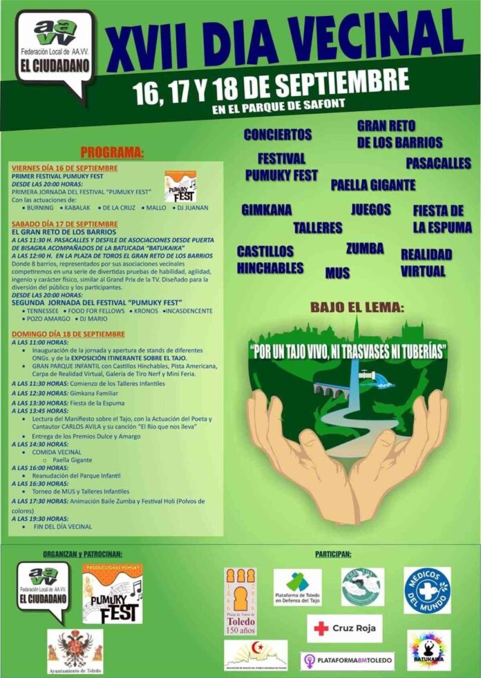 El Ayuntamiento de Toledo respalda la celebración y recuperación del XVII Día Vecinal que tendrá lugar a partir de este viernes y durante todo el fin de semana con multitud de actividades y propuestas dirigidas al conjunto de la ciudadanía toledana para disfrute de todos y de forma gratuita en el parque de Safont.