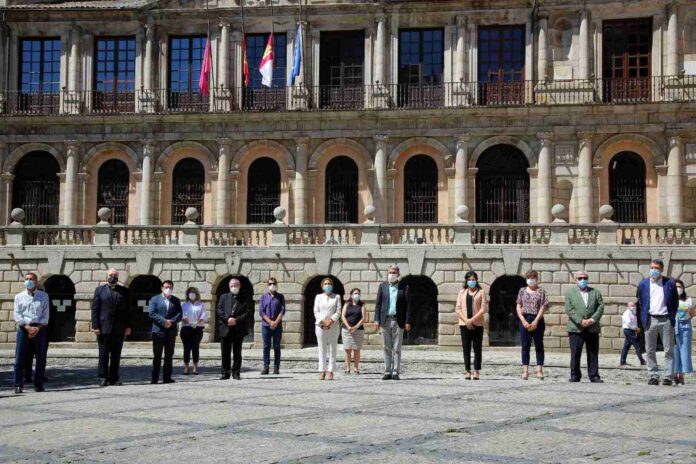 La alcaldesa de Toledo, Milagros Tolón, junto a ediles y concejalas de la Corporación municipal, se ha sumado este viernes al minuto de silencio convocado por el Gobierno de España en memoria y reconocimiento hacia las víctimas del coronavirus en el país coincidiendo con el último día de luto oficial.