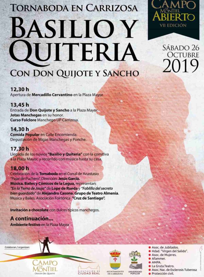 El sábado 26 de octubre en Carrizosa (Ciudad Real) será la tornaboda de Basilio y Quiteria. Y por ello, don Quijote de La Mancha y su fiel escudero, Sancho Panza, adelantarán su llegada. Ese día llegarán a Carrizosa y entrarán en la Plaza Mayor del municipio. En dicho lugar tendrá lugar el almuerzo a las 13.45 horas. Participarán también en la comida popular. Esta iniciativa cultural se basa en la novela universal de Miguel de Cervantes. La misma se enmarca en el programa cultural comarcal “Campo de Montiel Abierto”. Y cada año desde la Plataforma Campo de Montiel Origen del Quijote, se busca poner en valor los 23 pueblos de la comarca.