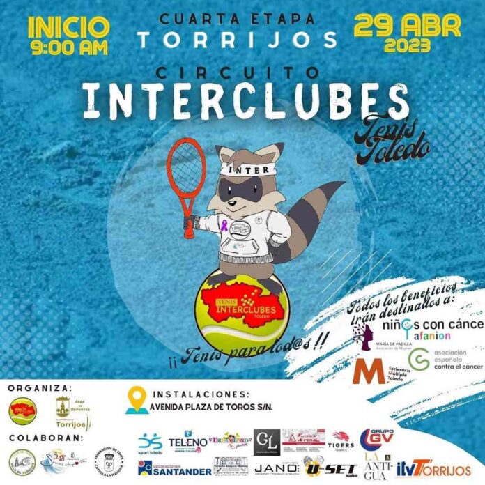 El Circuito Interclubes de Tenis Federado se acerca a su conclusión con la disputa de la cuarta etapa que se celebrará el próximo sábado 29 de abril en la localidad toledana de Torrijos, dentro de los actos englobados de su Semana de la Juventud y el Deporte. La prueba se celebrará en complejo deportivo municipal de Torrijos (Toledo), como parte de un proyecto deportivo englobado bajo programa Somos Deportes 3-18 de la Consejería de Educación, Cultura y Deporte de la Junta de Comunidades de Castilla-La Mancha y la Federación de Tenis de Castilla-La Mancha. En esta ocasión se han formalizado un total de 108 inscripciones para una prueba que dará comienzo a las 09:00 horas en el recinto ubicado en la Avenida de la Plaza de Toros s/n del citado municipio. El termino de los partidos, los más pequeños podrán disfrutar de diversas actividades lúdicas, entre ellas, podrán pintarse el rostro con los motivos que elijan.