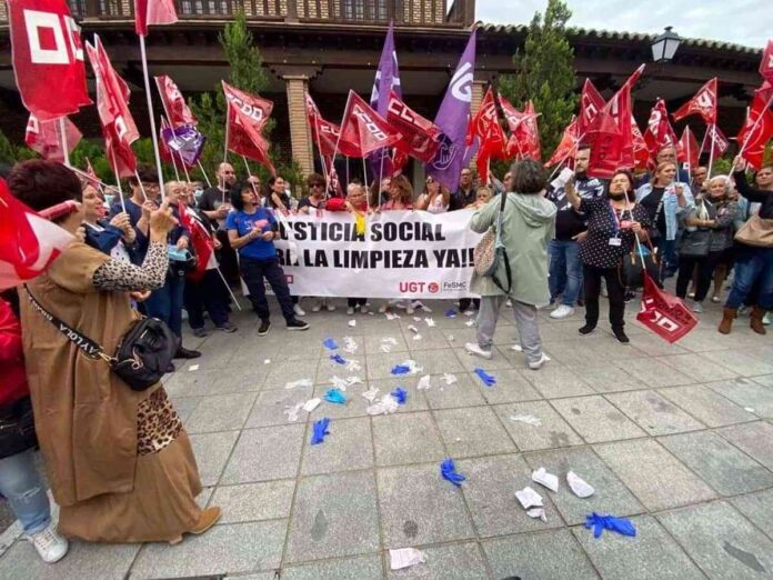 «Si no firmamos, no limpiamos». «Si no hay salarios no fregamos». Durante más de una hora, entre pitos, petardos y ondear de banderas de sus sindicatos, CCOO y UGT, las manifestantes no han dejado de corear sus reivindicaciones y de instar a la patronal a atender sus reivindicaciones: «Patronal, escucha: estamos en la lucha. Y si esto no se arregla, huelga, huelga, huelga.»