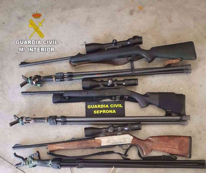 Tras un minucioso reconocimiento del terreno por parte de los agentes, se localizaron las fundas de las armas, un trofeo de corzo amarrado a un árbol, así como tres armas largas para la caza mayor, municionadas y equipadas con visores de gran potencia, artes y medios utilizadas para la caza, ocultos entre los matorrales y separados entre sí, en una zona de aproximadamente 1 hectárea de masa forestal.