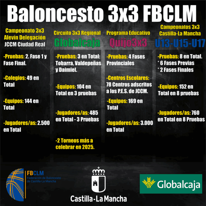 Una de las principales iniciativas que ha contribuido a este auge es el 3×3 Circuito Globalcaja, que se ha consolidado como pionero en la modalidad, junto al Programa Educativo “Quijo3x3” y el Campeonato de Castilla-La Mancha U17 de Clubes. Este año, la oferta se ha ampliado con la inclusión de los Campeonatos de Castilla-La Mancha U13 y U15 (tanto masculino como femenino), los cuales contaron con cuatro torneos clasificatorios y culminaron en una emocionante fase final. Esta fase final ha permitido que los equipos de la región compitan en los campeonatos nacionales en Melilla, lo que representa un paso significativo para el futuro del 3×3 en Castilla-La Mancha.