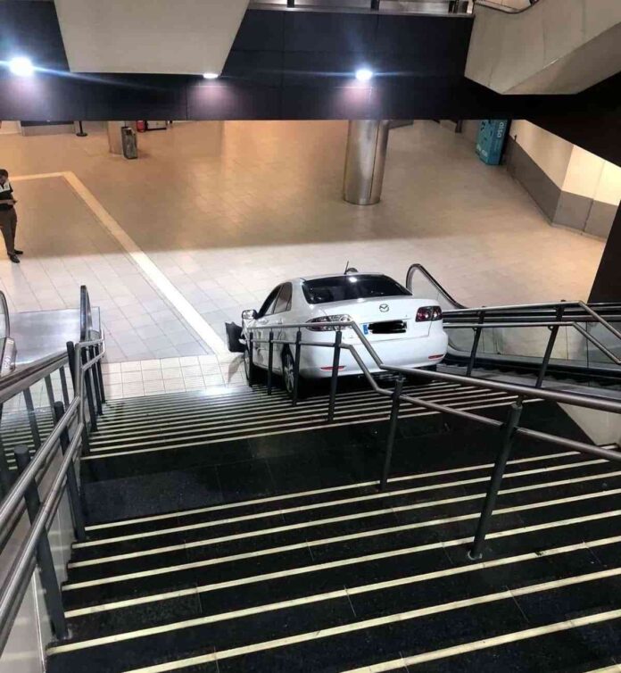 Un joven conductor de unos 36 años entro al intercambiador de Plaza Elíptica con un vehículo robado por el acceso exclusivo de los autobuses de la A-42, atravesó unas puertas de cristal y se quedo totalmente encajado en las escaleras interiores.