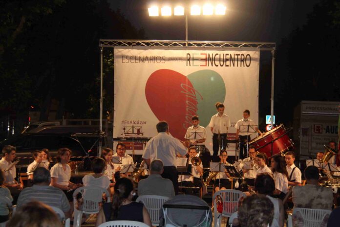 También la Asociación Banda de Música de Alcázar, adaptó su actuación a la normativa debido a la crisis sanitaria. La plantilla reducida a 60 músicos divididos para actuar en cada una de las dos partes del concierto, que ha tenido un programa íntegramente de pasodobles. La elección de este género era el idóneo para los 30 músicos que podían sentarse en el espacio destinado a escenario, guardando las medidas de seguridad establecidas, según explicaba el presidente de la asociación, Jorge Román.