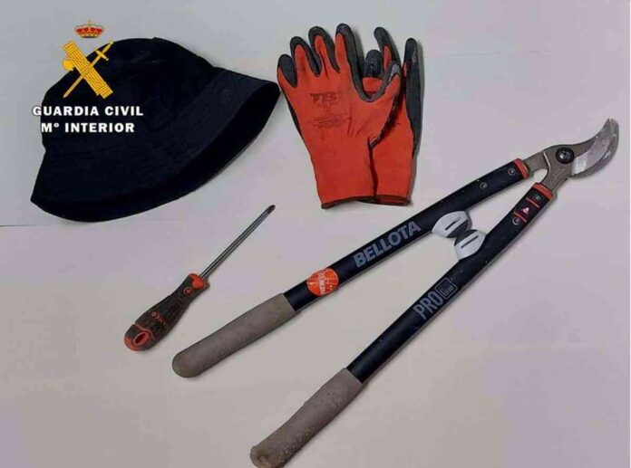 En el momento de la detención, y tras el registro del vehículo, la Guardia Civil localizó en su interior una cizalla de grandes dimensiones y unos guantes utilizados por el autor para la comisión del hecho delictivo.