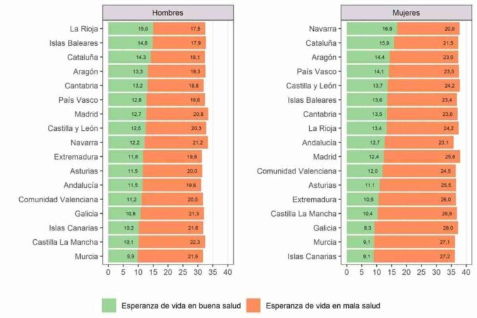 Las comunidades autónomas que tienen una esperanza de vida en buena salud más alta son la Rioja, Islas Baleares y Catalunya en hombres y Navarra, Catalunya y Aragón en mujeres, mientras que por la cola se encuentran Murcia, Castilla-La Mancha e Islas Canarias en hombres e Islas Canarias, Murcia y Galicia en mujeres.