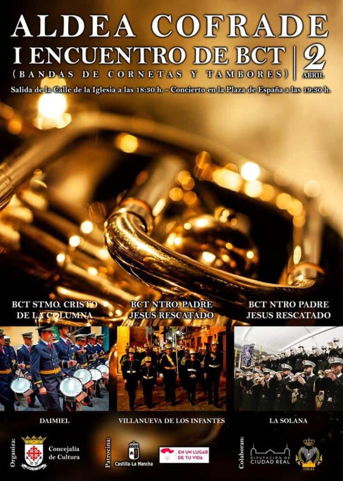 El I Encuentro de Bandas de Cornetas y Tambores “Aldea Cofrade”, tendrá lugar el sábado 2 de abril, saliendo de la Calle de la Iglesia, a las 18,30 horas, para celebrar el concierto en la Plaza de España, sobre las 19,30 horas. En el que participan la ‘Banda de Cornetas y Tambores “Nuestro Padre Jesús Rescatado” de La Solana; La Banda de Cornetas y Tambores “Nuestro Padre Jesús Rescatado” de Villanueva de los Infantes y La Banda de Cornetas y Tambores “Stmo. Cristo de la Columna” (Los Coloraos) de Daimiel.