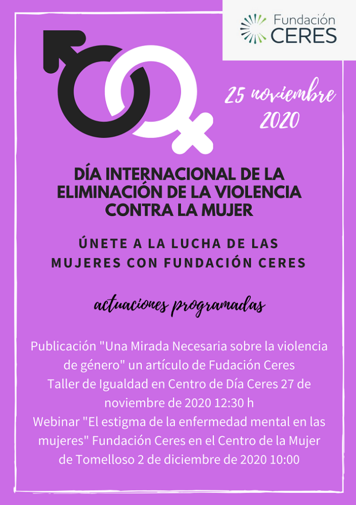 Desde Fundación CERES se quiere sensibilizar y visibilizar la gran problemática que ocasiona este tipo de violencia, que afecta a la mitad de la población, llevándose cada día una nueva víctima y dejando a su paso episodios de frustración, miedo e injusticia y especialmente este año 2020 que durante el periodo del confinamiento por la Covid-19, muchas de las mujeres se han visto obligadas a vivir situaciones de aislamiento con su pareja maltratadora las 24 horas del día, dejando secuelas psicológicas en mujeres que necesitan de un apoyo y ayuda especializada.