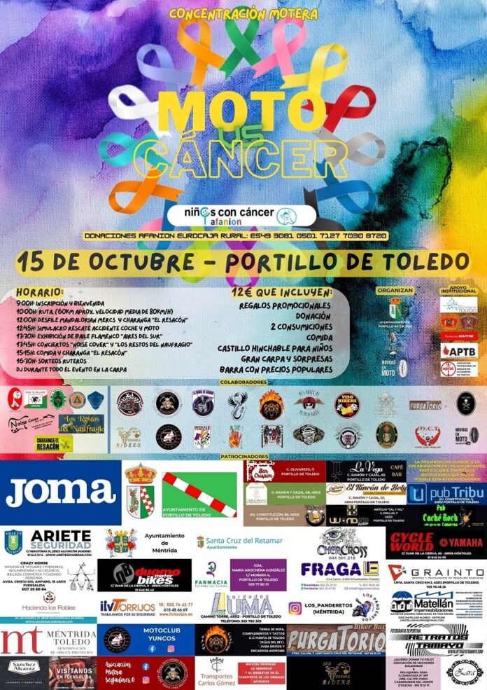 “MotoVSCáncer” tendrá su punto festivo final en la localidad de Portillo de Toledo. Allí, el domingo 15 de octubre, desde las 9:00 horas, los moteros solidarios podrán inscribirse en una ruta, fiesta y comida en la que, con 12 euros, se ayudará todo lo posible a AFANION. El motero tendrá derecho a dos consumiciones y a comida en la plaza de España, así como a distintos regalos promocionales y sorpresas. El Ayuntamiento de Portillo de Toledo se ha volcado con la actividad desde el primer momento aportando voluntarios, colaboradores, patrocinadores, así como todo lo necesario para que la máxima can(dad recaudada durante esa jornada vaya des(nada a los protagonistas de la cita que son los niños y familias de AFANION. Además, varios establecimientos de restauración de la localidad se han ofrecido para ayudar en todo lo que sea necesario para que la cita, además de benéfica, sea un éxito.