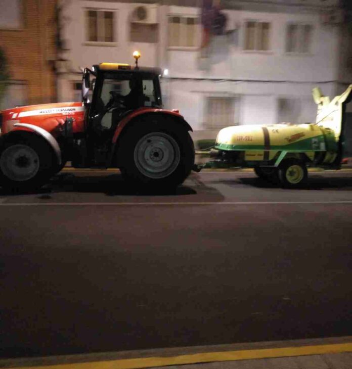 “La gran colaboración ciudadana se nota también cada noche, por parte de los agricultores, que se han ofrecido en una gran mayoría al Ayuntamiento, para ayudarnos en las tareas de limpieza y desinfección, por eso esta semana empezamos con dos tractores cada noche a fumigar con desinfectante, repartiéndonos el pueblo en dos sectores”, añade el alcalde.