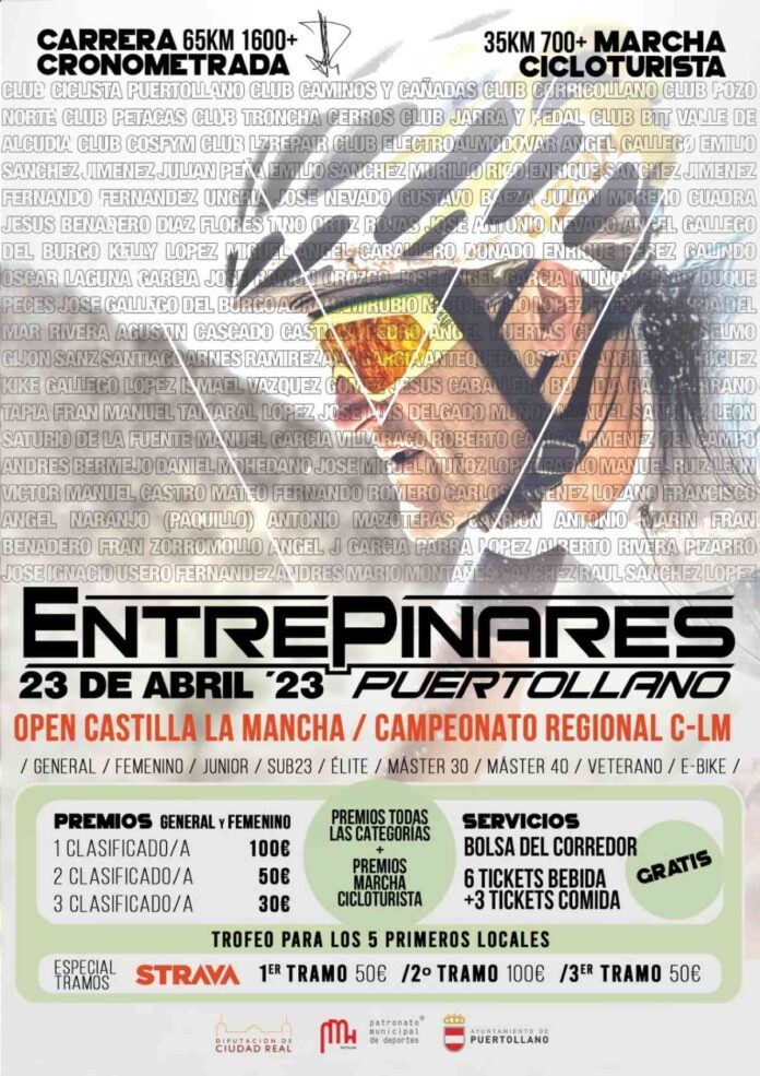La V edición de Entrepinares de carrera cronometrada y marcha cicloturista se celebrará el domingo 23 de abril en Puertollano (Ciudad Real) con participación de 200 corredores. Esta es una prueba de bicicleta de montaña con más kilómetros de senderos del panorama nacional, que tras cinco años de andadura se ha convertido en eventos para deportistas y familiares.