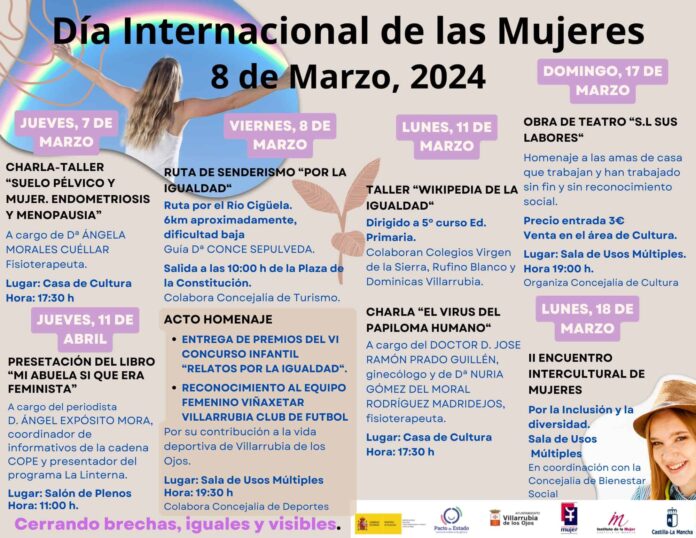 El Ayuntamiento de Villarrubia de los Ojos (Ciudad Real), a través de la concejalía de Igualdad de Género y su Centro de la Mujer, han organizado un variado programa de actos para conmemorar el Día Internacional de las Mujeres, del 7 al 18 de marzo, que consistirán en charlas, talleres, homenajes, colaboración en la 1ª Carrera por la Igualdad del IES Guadiana, ruta de Senderismo, reconocimiento al equipo femenino Viña Xétar Villarrubia CF, obra de teatro, presentación de un libro y el 2º Encuentro Intercultural de Mujeres por la inclusión y la diversidad, entre otros actos.