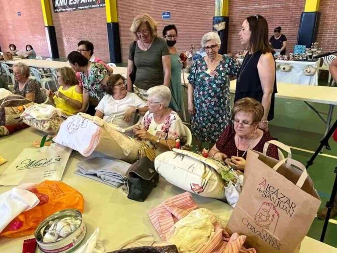 El pabellón Picasso, acogía el XXI encuentro de encajeras que la asociación El Torreón organiza anualmente. Llegadas de toda la región, las casi 200 mujeres y algún hombre pasaban la mañana compartiendo sus trabajos y mostrándolos a quienes se acercaron al pabellón alcazareño para admirar el movimiento de sus manos entre los bolillos y cuyo resultado no pasa inadvertido por su belleza y pulcritud, como explicaba Angelita Quiralte, presidenta de la asociación.