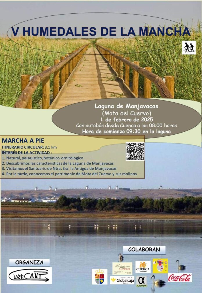 La Asociación Cultural “CuenCANP” ha anunciado la celebración de la V Edición de los HUMEDALES DE LA MANCHA, enmarcada dentro del Programa “Caminos de Agua”. Este año, la cita se llevará a cabo en el magnífico Complejo Lagunar de Manjavacas, ubicado en Mota del Cuervo. La actividad consistirá en un recorrido a pie de 8,1 kilómetros alrededor de la laguna, que fue declarada Reserva Natural en diciembre de 2001 y forma parte de la Red Natura 2000, contribuyendo al LIC y ZEPA de los Humedales de la Mancha.