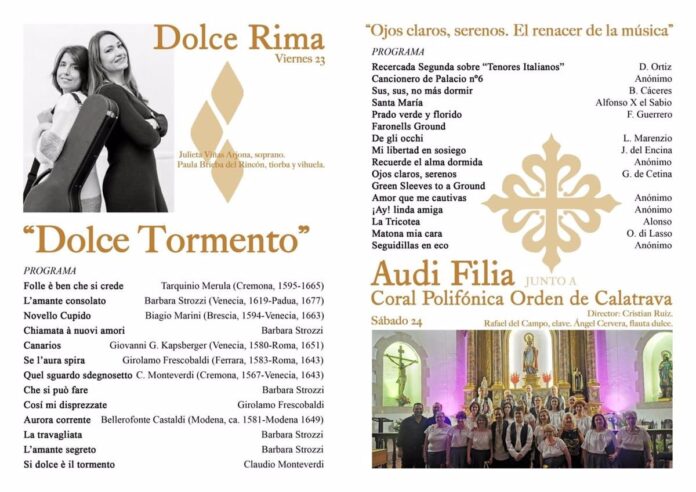 La experiencia musical continuará el sábado 24 de mayo con el dúo Audi Filia, que se unirá a la Coral Polifónica Orden de Calatrava de Almagro, bajo la dirección de Cristian Ruiz. El segundo día del festival, titulado ‘Ojos Claros, Serenos: El Renacer de la Música’, explorará la riqueza y diversidad de la música del Renacimiento español y europeo, interpretando obras de célebres compositores como Diego de Ortiz, Alfonso X el Sabio, Francisco de Guerrero, Juan del Enzina y Orlando di Lasso. La coral almagreña ejecutará estas obras con su habitual maestría y emotividad.