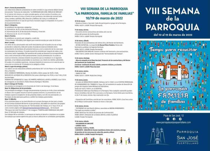 La VIII Semana de la Parroquia San José de Puertollano (Ciudad Real) se celebrará desde el 10 al 13 de marzo de 2022. Y dentro de dicha conmemoración se llevarán a cabo diversas actividades que puedes ver en la imagen de esta nota.